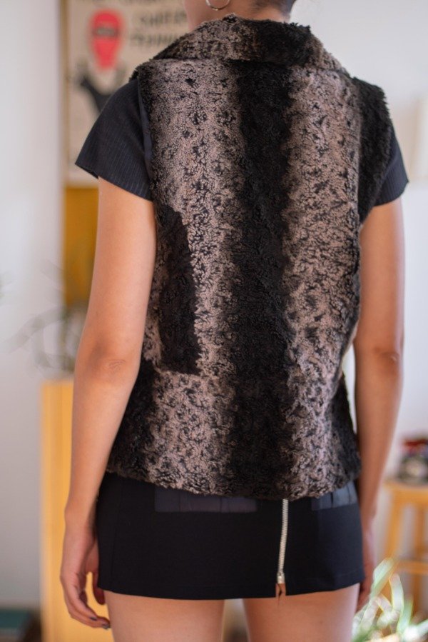 Chaleco de peluche con botones tipo montgomery al frente. Tiene forro interno de tafeta negro.