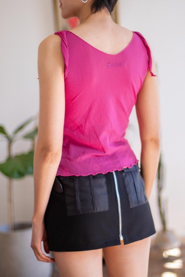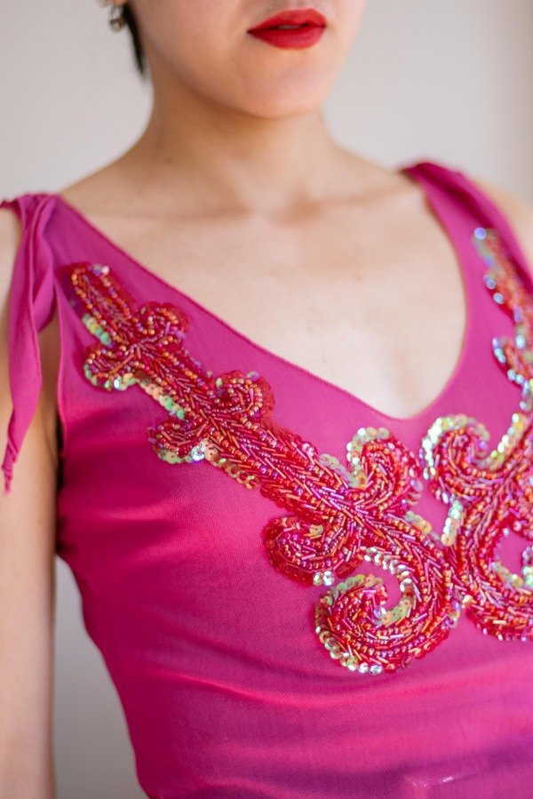 Top de microtul fucsia con bordado de lentejuelas y mostacillas en pecho. Cede bastante.