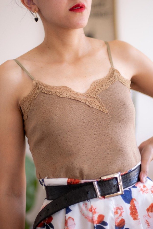 Top de algodón calado color beige oscuro, con encaje en el pecho y tiras elásticas regulables.