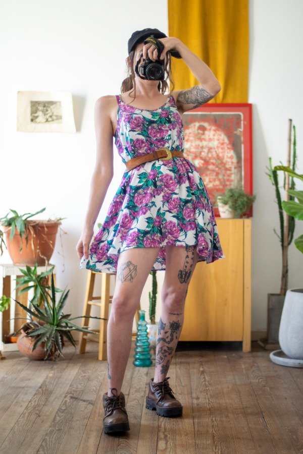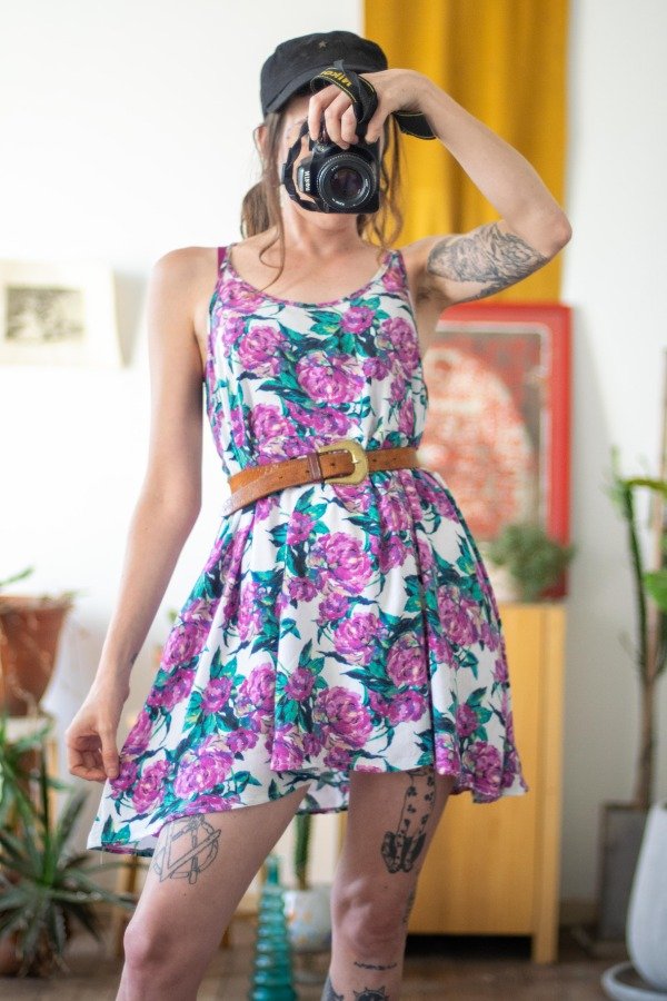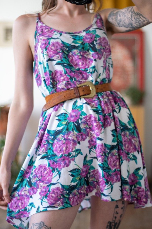 Vestido de tela tipo fibrana color blanca con estampado de flores fucsia. Corte bobo con tiras cruzadas en espalda, que queda descubierta.