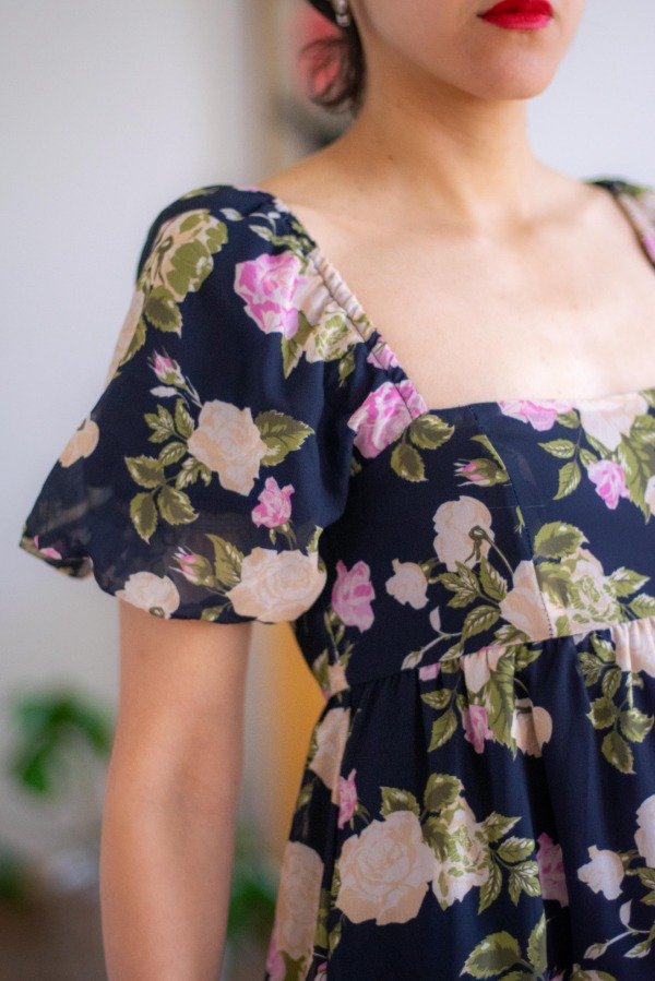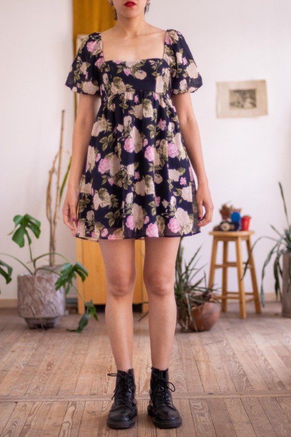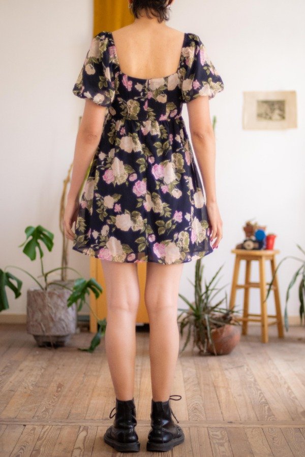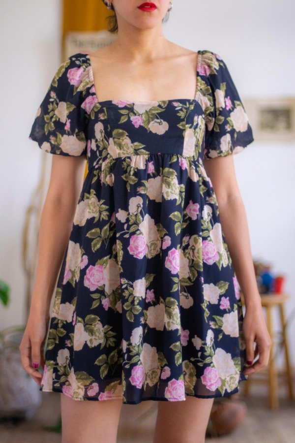 Vestido second hand de gasa azul oscura estampada. Se accede mediante cierre invisible en espalda. Tiene forro interno a tono.