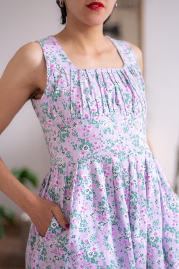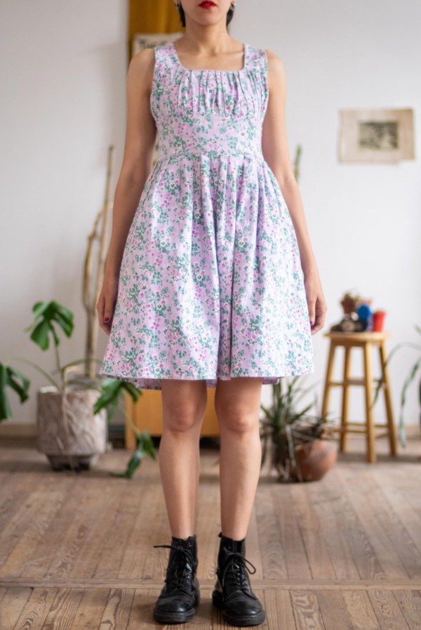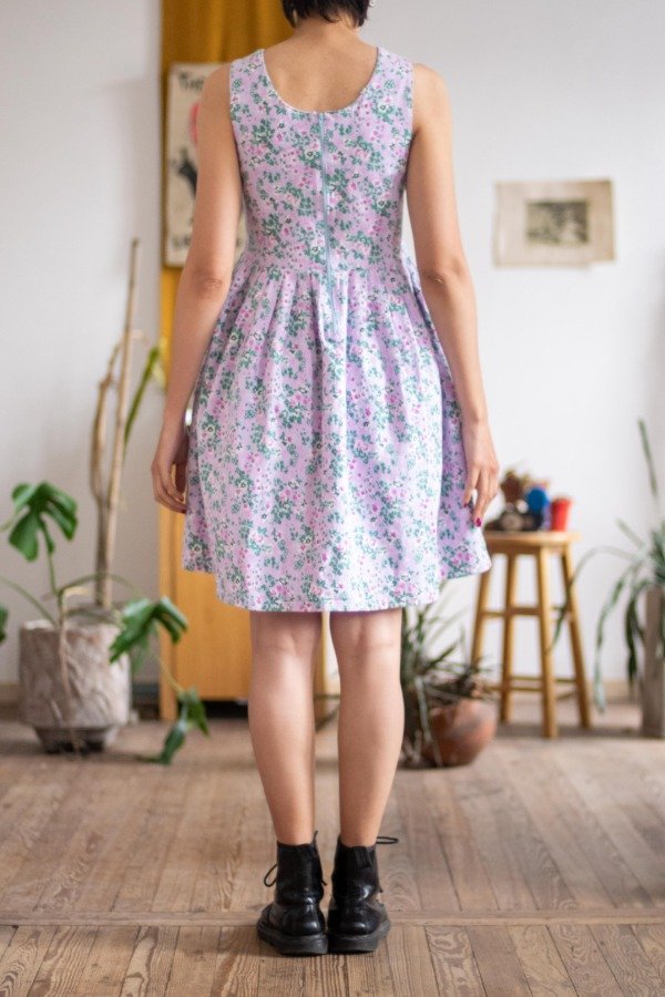 Vestido color lila clarito con flores estampadas. Es levemente elastizado. Tiene bolsillos y cierre en espalda.