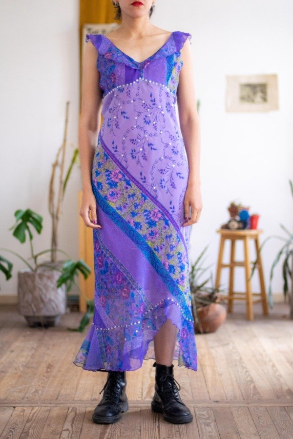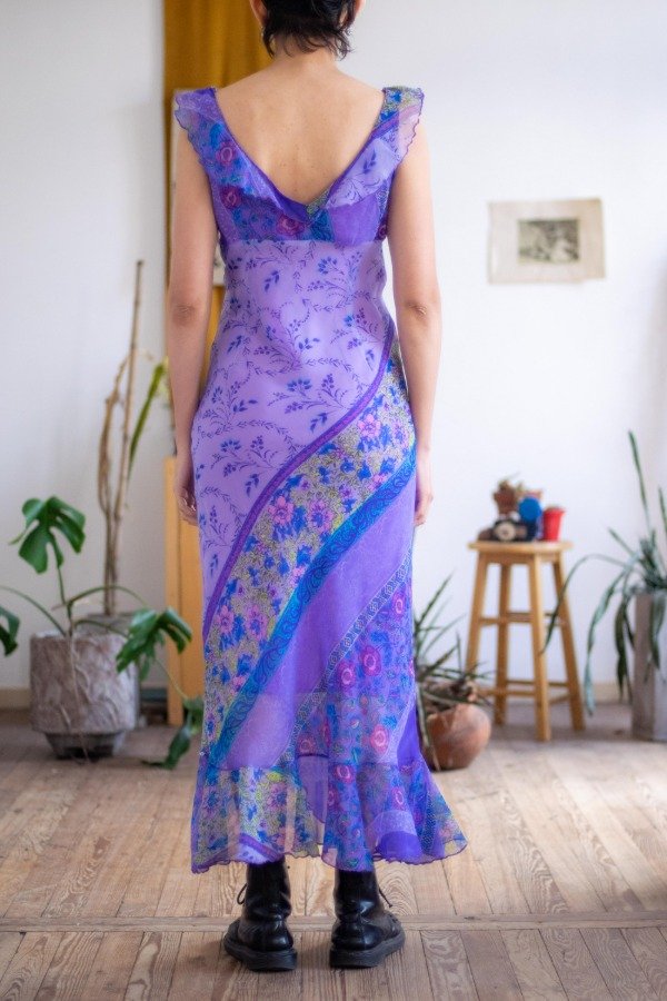 Vestido de gasa estampada con forro interno a tono y lentejuelas plateadas bordadas.