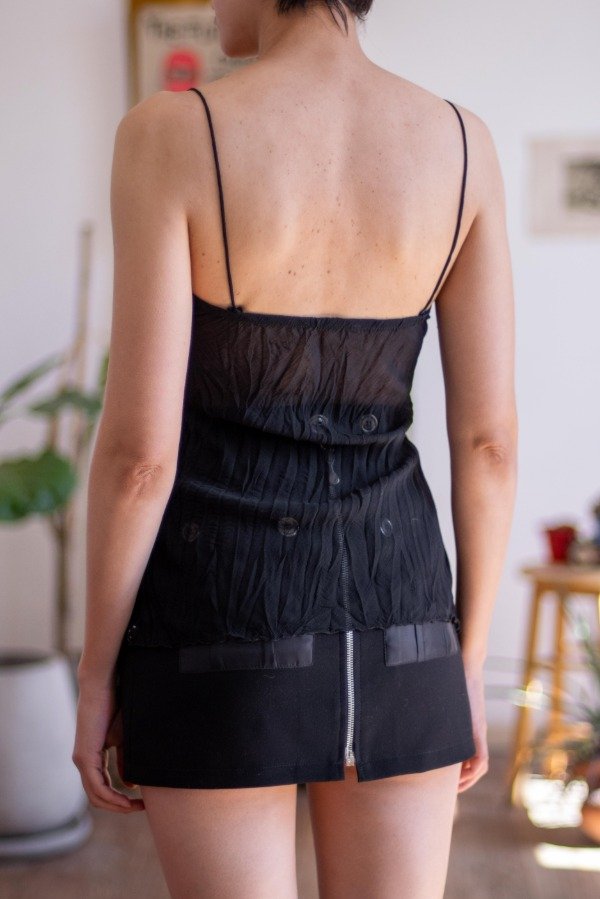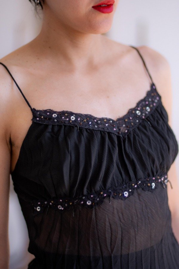 Top de gasa negro con doble tela en busto que evita que transparente en esa zona. Tiene detalles de encaje y mostacillas.