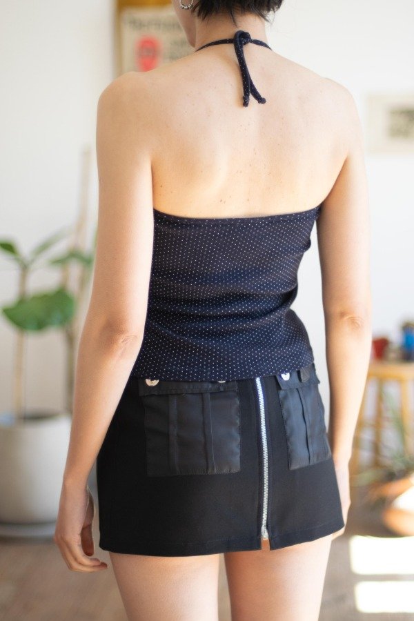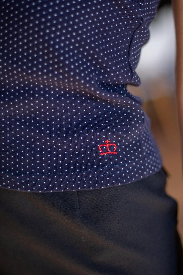 Top de algodón azul oscuro con pequeños lunares blancos. Se ata al cuello.