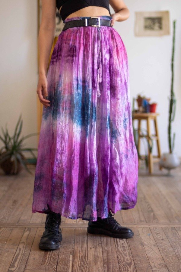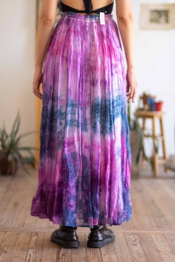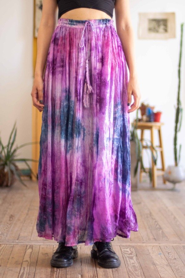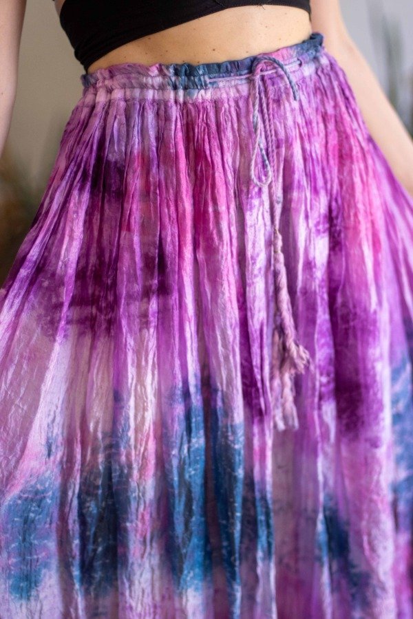 Falda de rayón en distinto tonos fríos. Se ajusta a la cintura mediante cordón por li que abarca varios talles.
