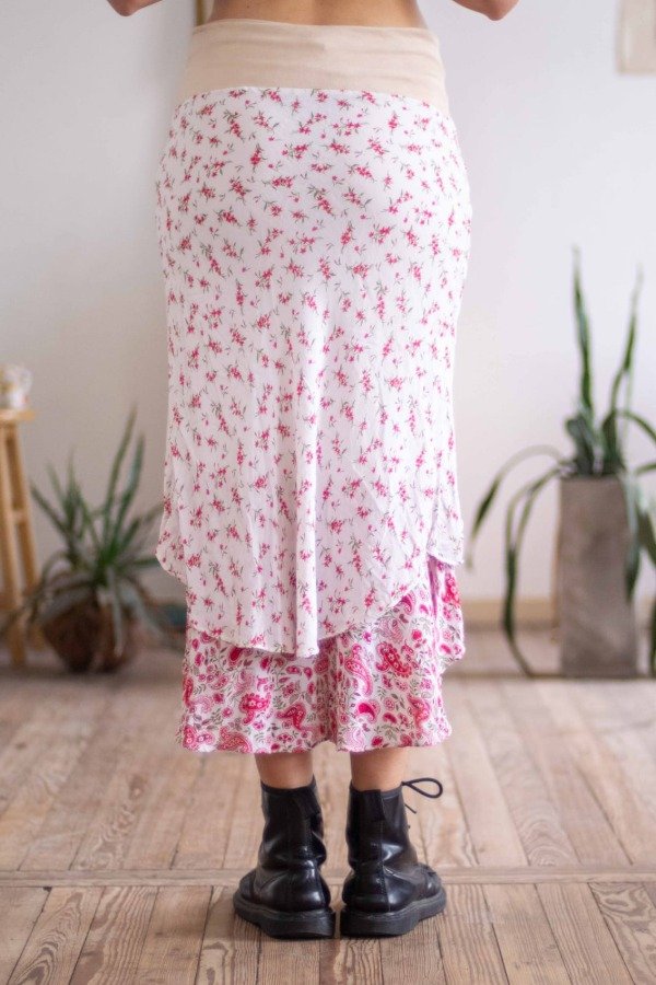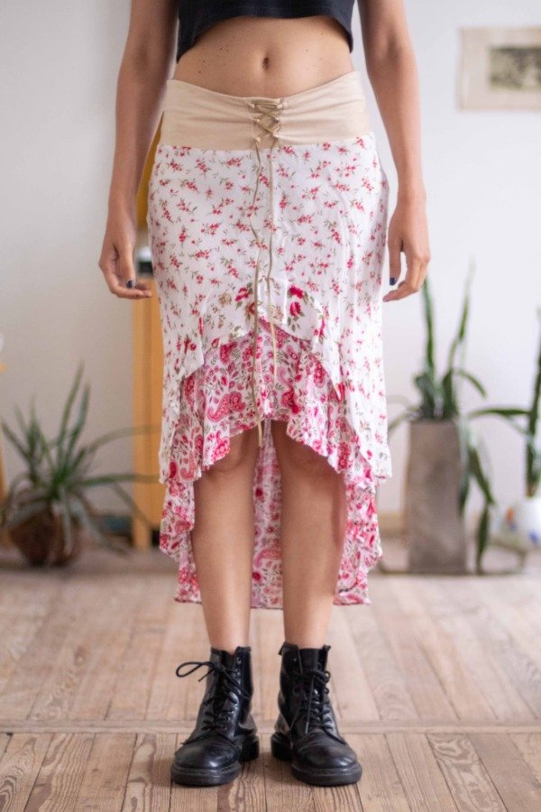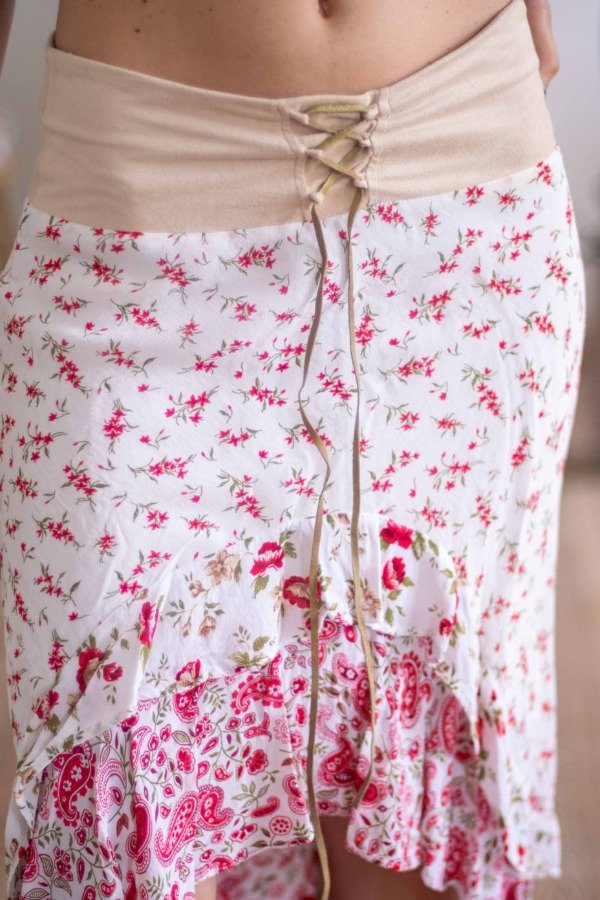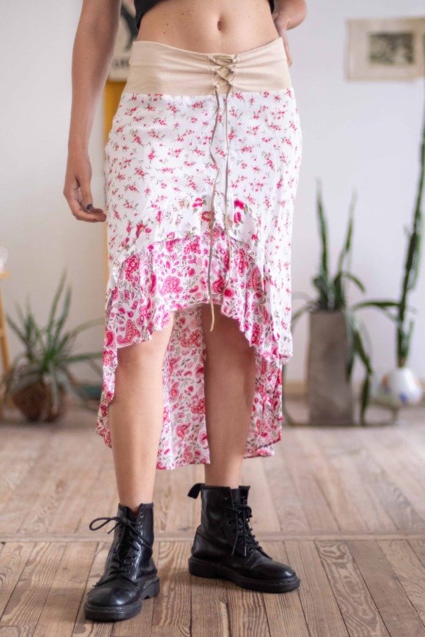 Falda irregular, más corta delante que detrás. Tiene la parte de la cintura en tela simil gamuza (sintético) con tiras tipo para ajustar.