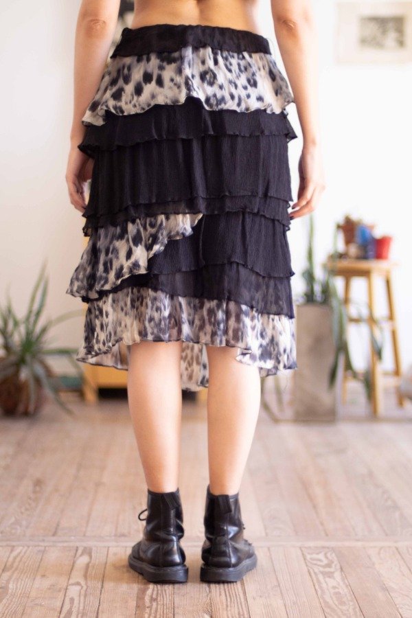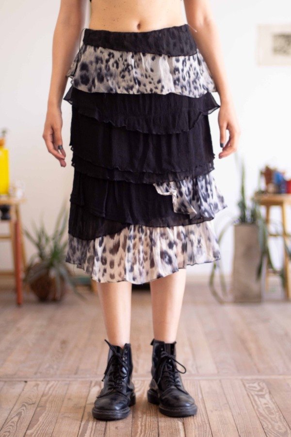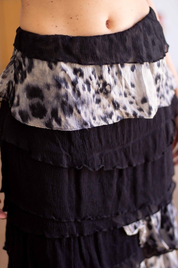 Falda de seda negra y estampada, con cintura elástica, de la marca Zara España.